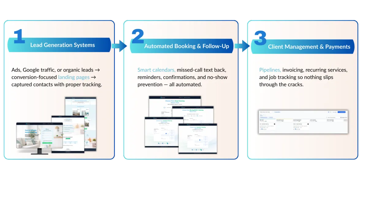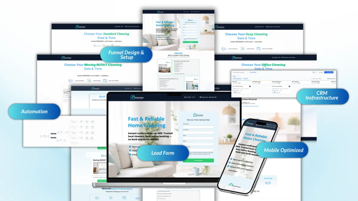 Every page is designed with a purpose — to guide leads, trigger automation, and move prospects smoothly toward booking.