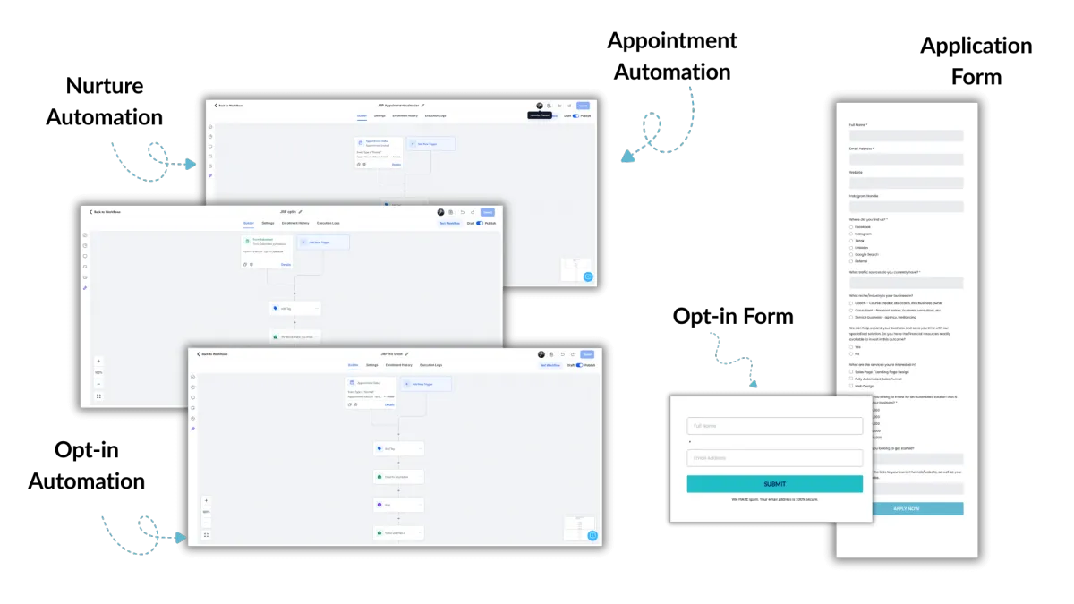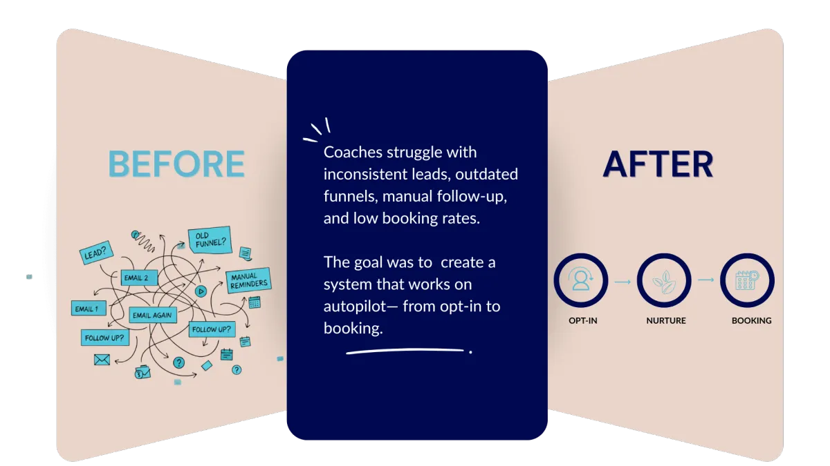 This project showcases a complete, end-to-end funnel system built to generate leads, nurture prospects, and seamlessly guide users toward booking a call. The entire build includes both front-end funnel pages and back-end automation systems, designed inside Go High Level (GHL) using minimalist, clean, and coach-friendly branding.